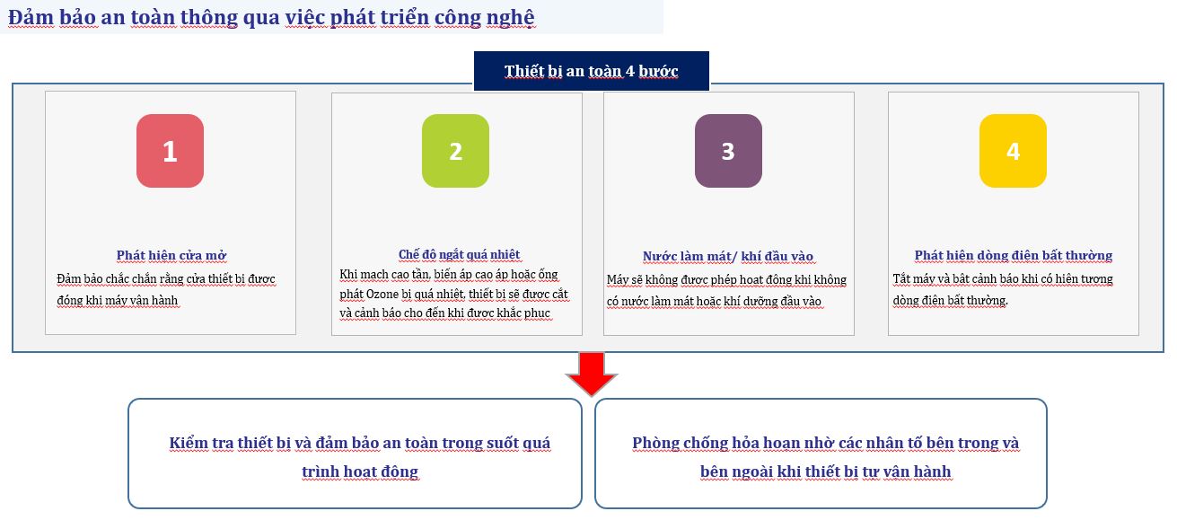 Đảm bảo độ an toàn và tính ổn định của máy Ozone bằng việc Kiểm soát nước làm mát, nguồn cấp khí, và chế độ ngắt quá nhiệt các bộ phận.