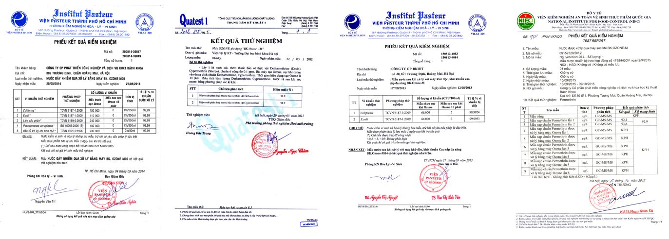 Một số kết quả thử nghiệm được thực hiện bởi Viện Pasteur, Quatest 1 và Bộ y tế trên sản phẩm máy ozone Bkidt